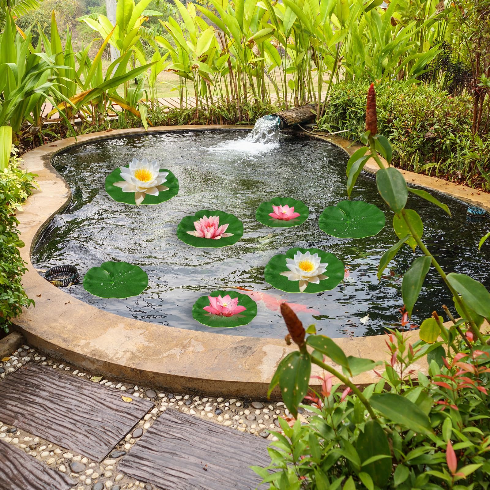 A beautifully designed pond constructed with sleek edges and a quiet water surface, enhanced by floating planters that introduce natural color and movement.
